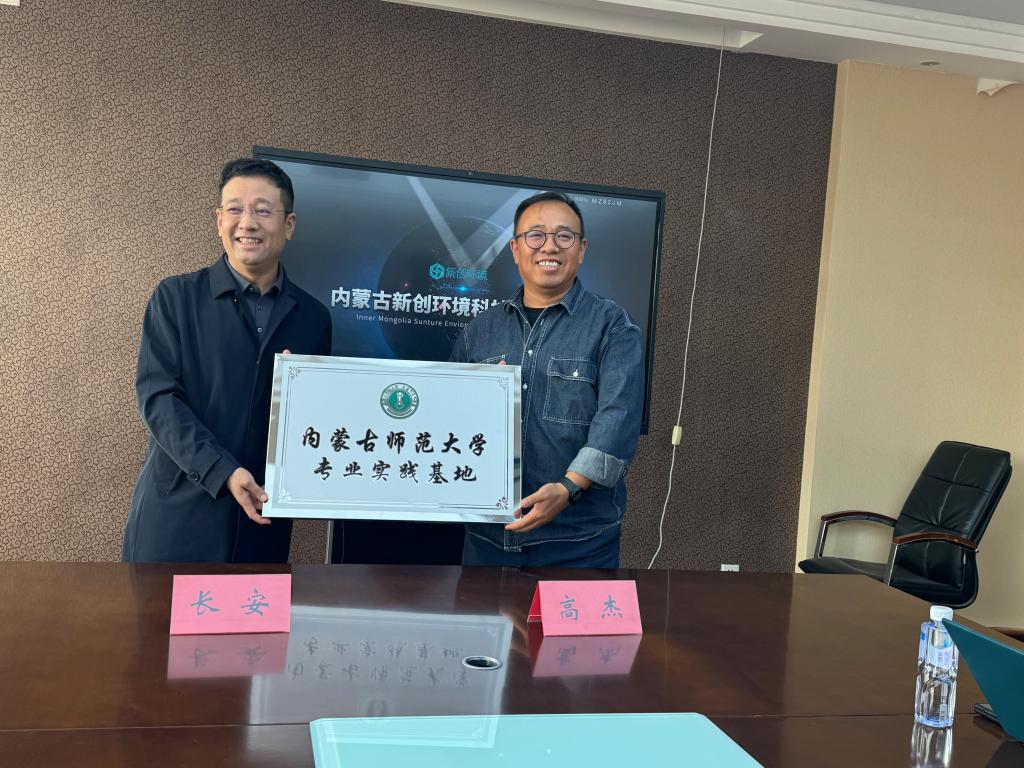 2024 年 10 月 9 日上午,beat365中文官方网站与内蒙古新创环境科技有限公司于该公司会议室成功举办校企合作共建专业实践基地揭牌仪式。beat365中文官方网站科研处副处长周丹丹、beat365中文官方网站院长长安、beat365中文官方网站教务处实践教学科董振华、地理系主任阿荣、副系主任郭恩亮与斯琴朝克图,以及内蒙古新创环境科技有限公司总经理高杰、行政副总马晶晶、总工张玮、东联循环(子公司)总经理王林、美成生态(子公司)总经理范志勇、众元测试(子公司)总经理郝文强出席了此次揭牌仪式。