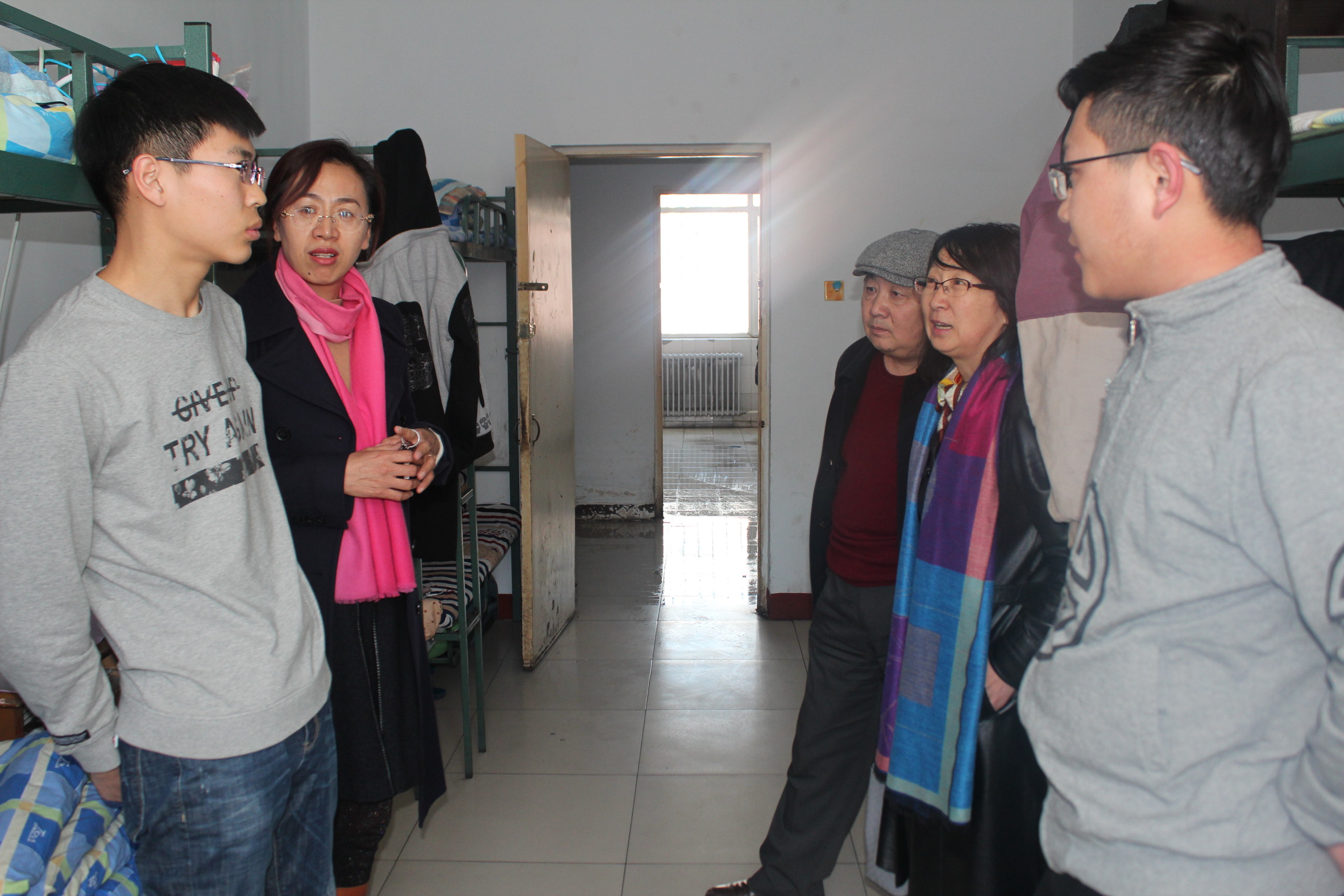 新学期伊始,为加强综合治理工作,提高安全防范意识,提升学生宿舍文明,把握学生返校后的思想动态,2017年3月1日下午,beat365中文官方网站院长包玉海教授,党总支副书记(主持工作)、副院长张裕凤教授,党总支副书记李雨薇老师深入到beat365官网学生宿舍,对学生进行慰问,并对宿舍安全进行检查。
